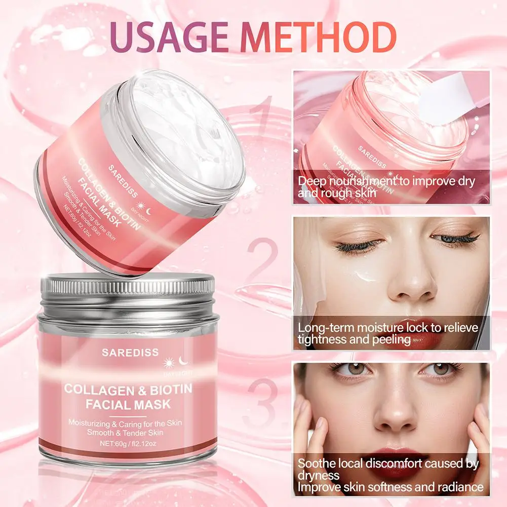 تحسين ملمس البشرة: الاستخدام المنتظم لأقنعة الوجه المصنوعة من الكولاجين يمكن أن يساعد في تحسين ملمس البشرة، مما يجعل البشرة أكثر نعومة ونعومة عند اللمس.